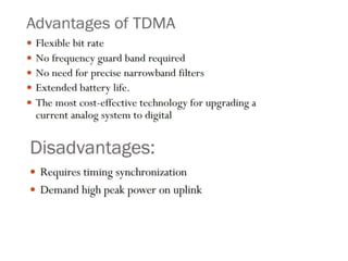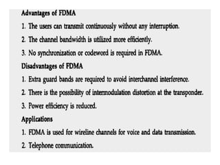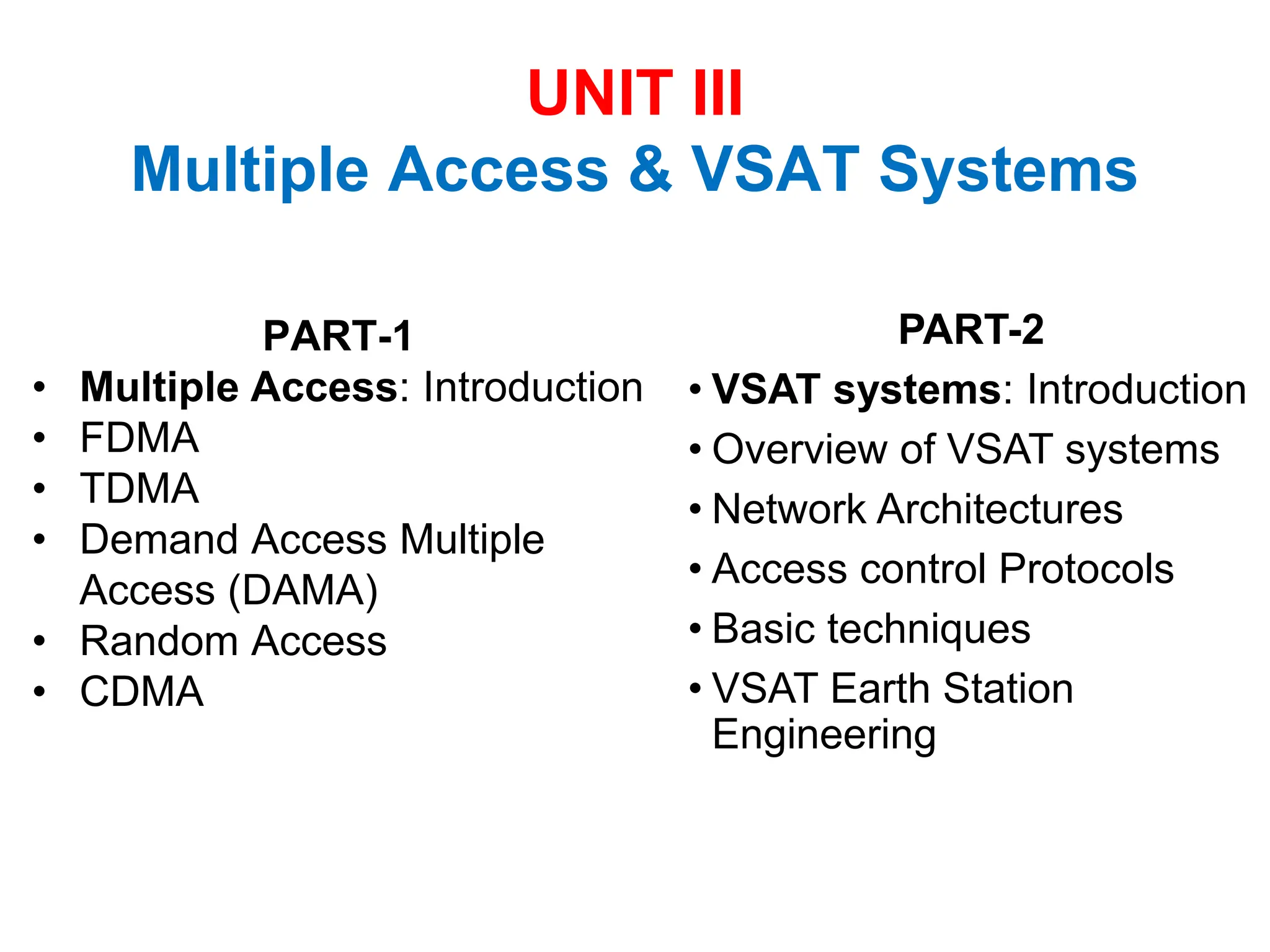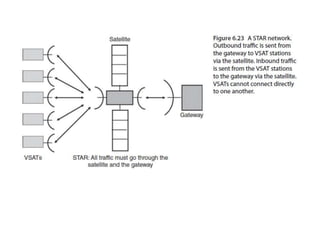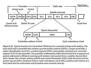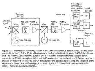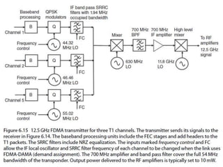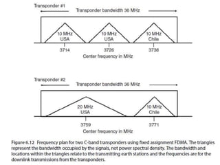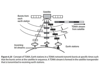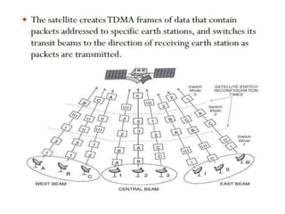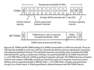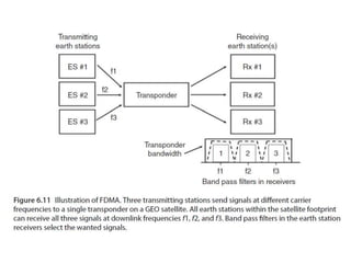 This document discusses multiple access techniques for satellite communications, including FDMA, TDMA, and CDMA. It then focuses on VSAT systems, providing an overview of their network architectures, access control protocols, and earth station engineering. The key multiple access techniques - FDMA, TDMA, and CDMA - are explained in detail, covering how each technique allows multiple signals to be transmitted simultaneously through the same satellite transponder. TDMA and FDMA can be combined in hybrid schemes such as MF-TDMA commonly used for internet access via satellite.