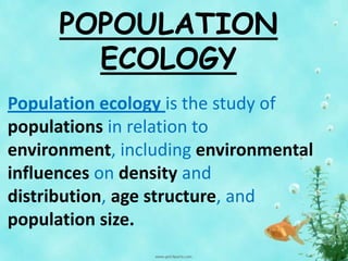 Population ecology studies the interactions between populations and their environments, focusing on factors like density, dispersion, and demographic patterns. It explores various growth patterns, including exponential and logistic growth, and examines influences on population regulation such as density-dependent and independent factors. Additionally, the document discusses human population trends and social organization within species, as well as community structures and ecological succession.