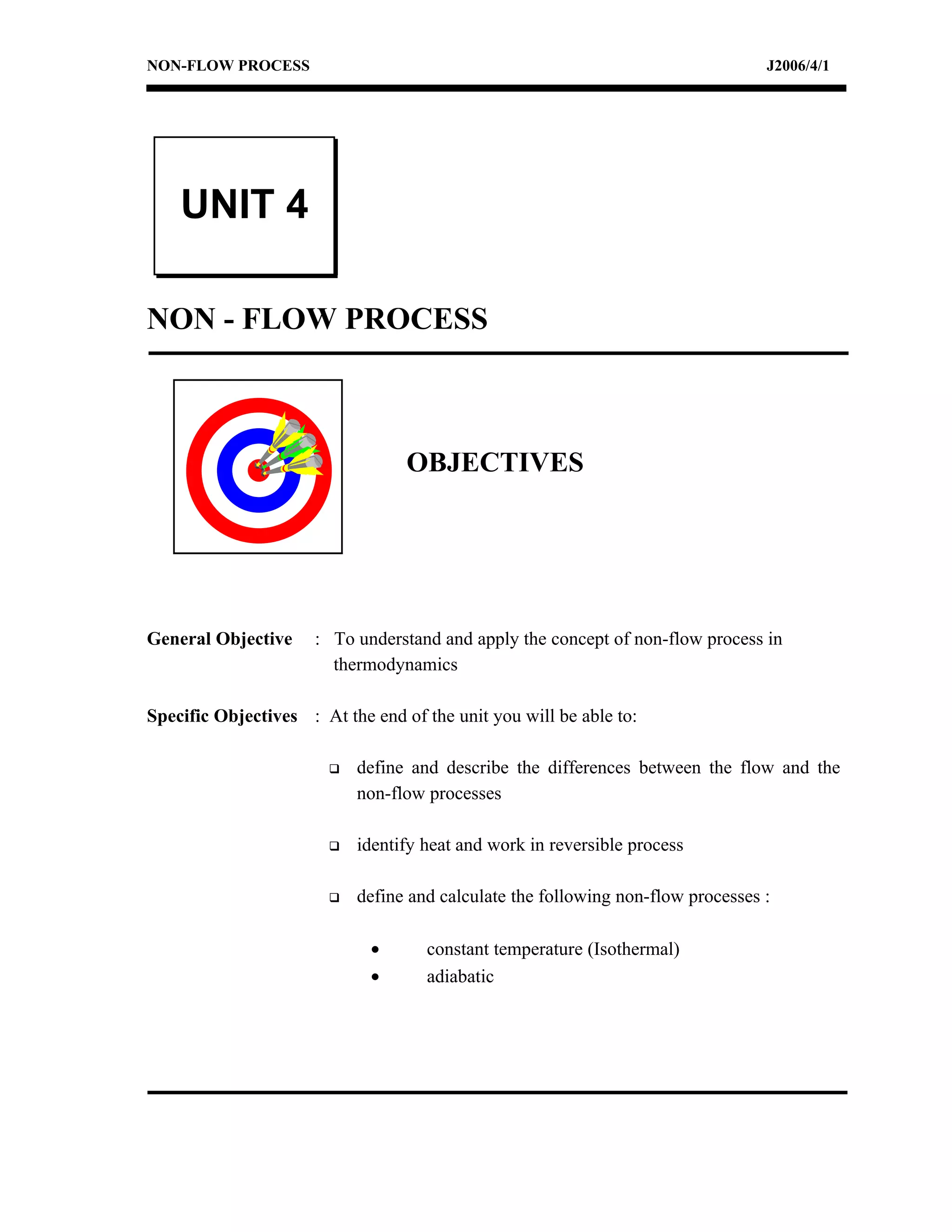The document discusses non-flow processes in thermodynamics, which occur when a fluid is sealed within a system and cannot cross the system boundary. It defines non-flow processes and differentiates them from flow processes. It then describes two important non-flow processes: [1] isothermal processes, where temperature remains constant, and [2] adiabatic processes, where there is no heat transfer. Equations are provided for calculating work and other properties for gases undergoing these reversible, non-flow processes. Examples are included to demonstrate applying the concepts and equations.