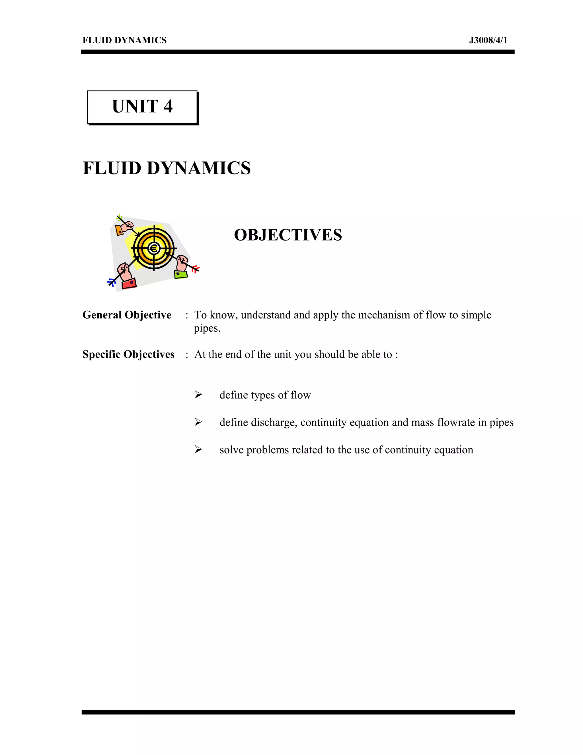 This document discusses fluid dynamics and flow through pipes. It defines types of flow such as steady, uniform, laminar and turbulent. It also defines concepts like discharge, mass flow rate, and the continuity equation. Examples are provided to demonstrate how to use the continuity equation to calculate velocities and flow rates at different points in pipes with changes in diameter or branches.