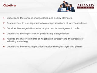 This document outlines key concepts and elements of international negotiation. It discusses reasons for negotiation including sharing resources, creating new opportunities, and resolving disputes. Important themes in negotiation include bargaining, negotiation, interdependence, and understanding. Negotiations involve two or more interdependent parties seeking agreements through concessions. Effective negotiation requires understanding goals, strategies, tactics, information gathering, and implementing agreements. The document provides an overview of concepts like BATNA, mutual adjustment, value claiming and creating, conflict management styles, and the negotiation process.