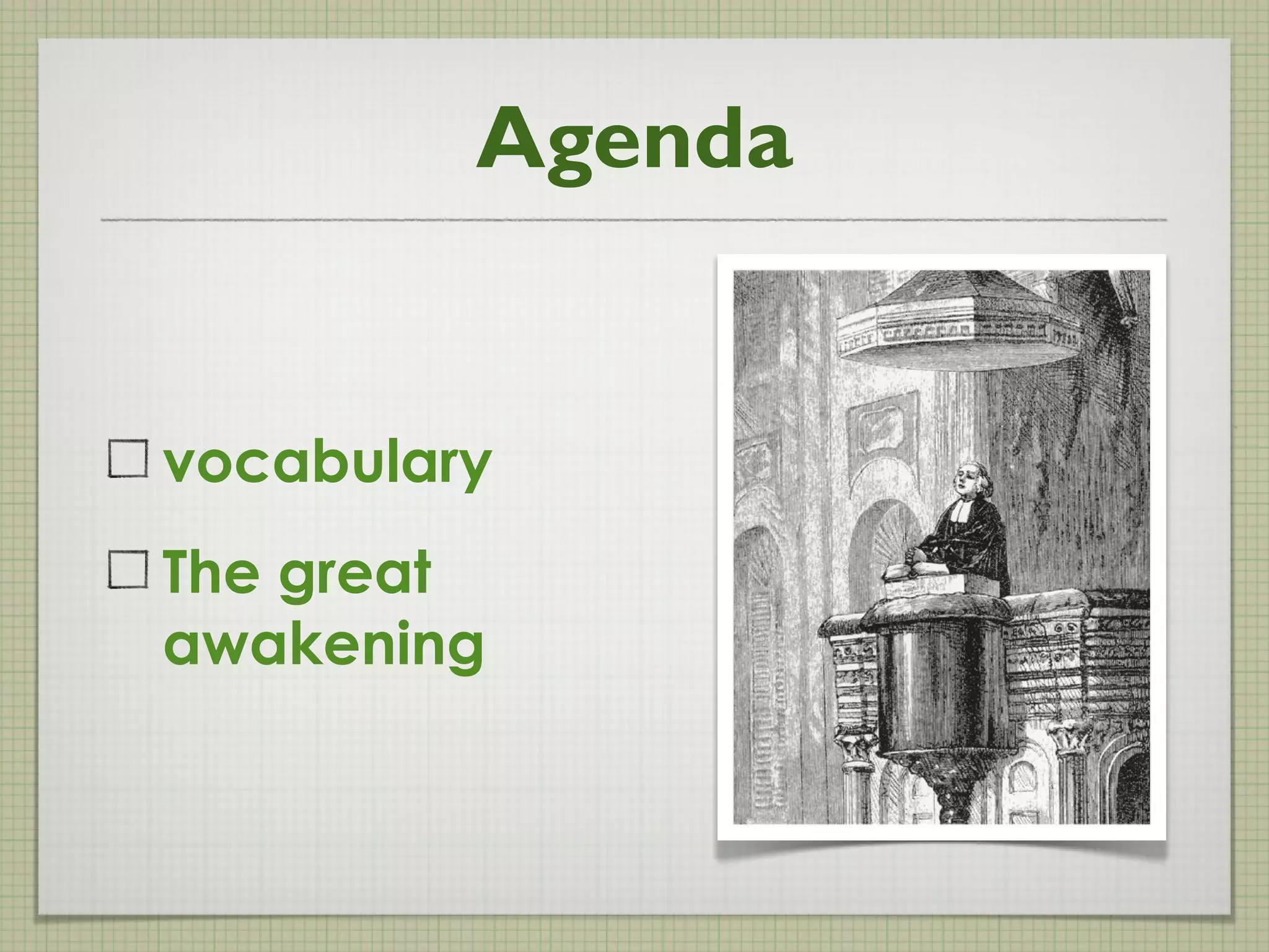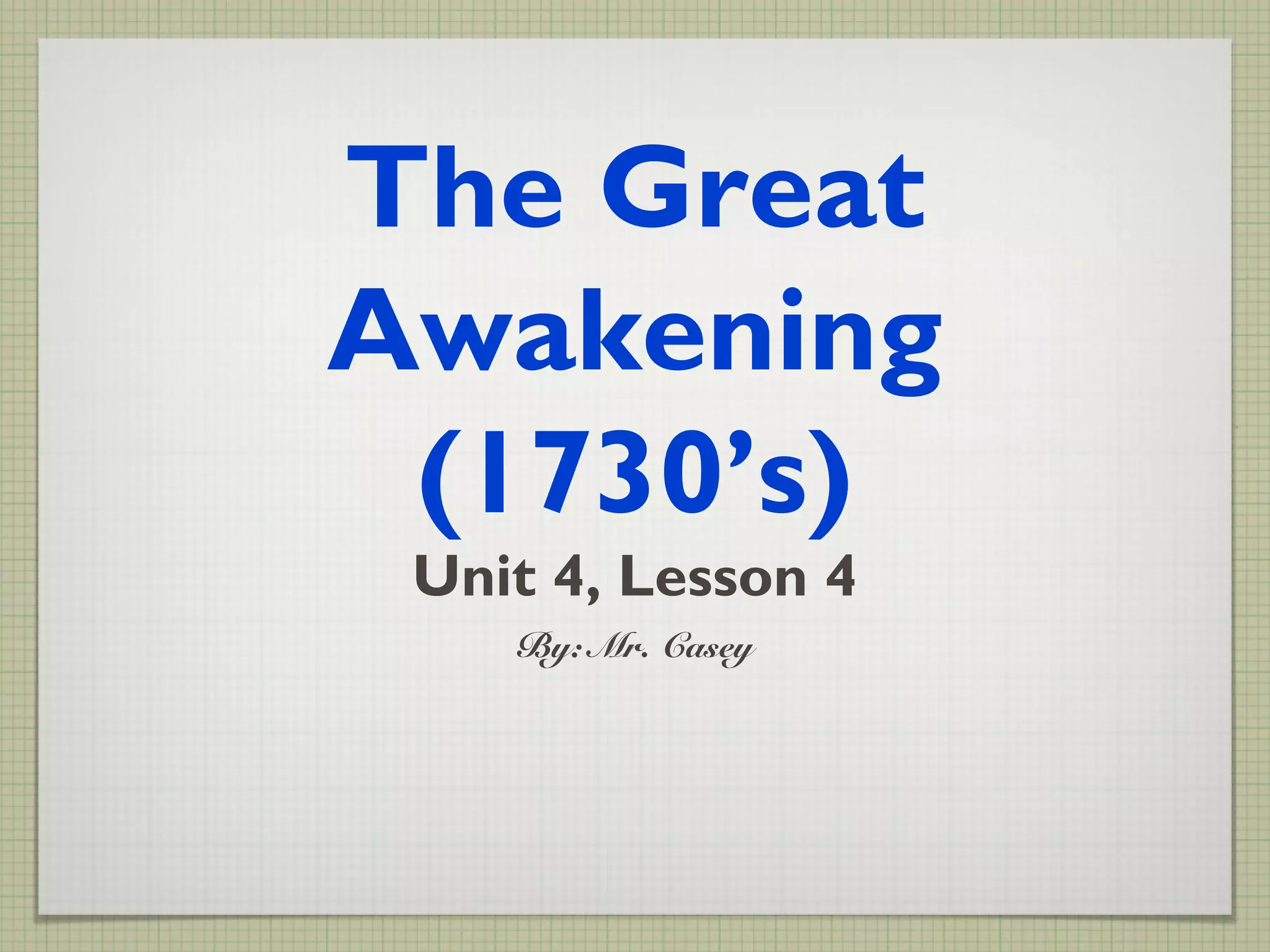 The Great Awakening was a period in the 1730s when preachers began traveling throughout the colonies holding religious revivals. These new preachers believed that everyone, not just religious leaders, should have an emotional relationship with God. The revivals drew people from different religions and social classes together and encouraged them to question religious authority. Notable preachers during this time included Jonathan Edwards and George Whitefield, who advocated for a more personal faith and criticized walls between congregations and their members. The Great Awakening increased religious interest and dedication, taught people to question authority, and helped create new religious denominations like Methodists and Baptists.