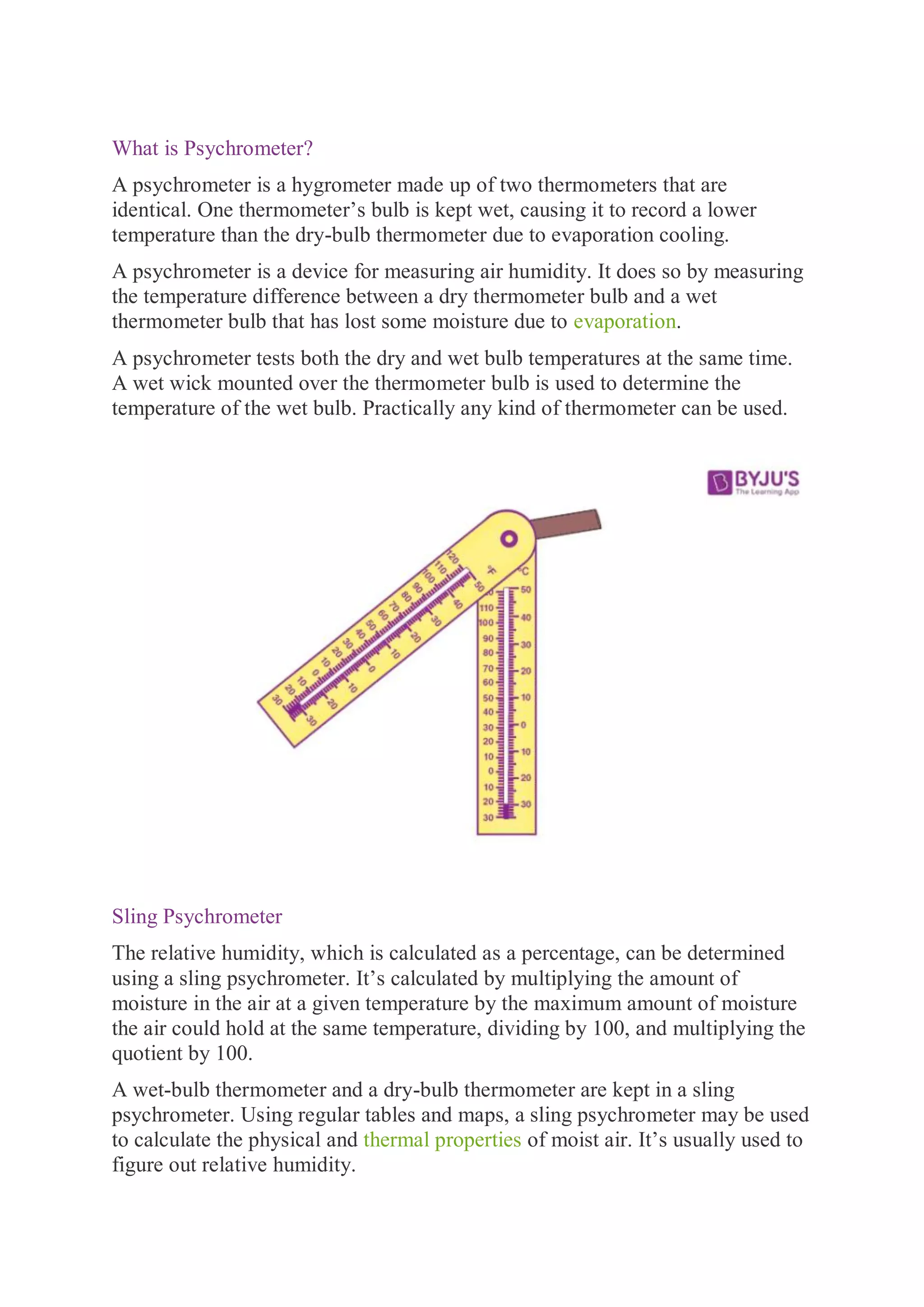 A psychrometer is a device used to measure humidity by measuring the temperature difference between a dry bulb thermometer and a wet bulb thermometer. The wet bulb thermometer is wrapped in a wet wick, so evaporation causes it to read a lower temperature than the dry bulb. This temperature difference can be used along with psychrometric charts to determine values like relative humidity, specific volume, and enthalpy of air. A sling psychrometer has the thermometers mounted together so the wet bulb can be whirled to speed evaporation. Manual psychrometers are still used but require more work from the user compared to digital psychrometers. Psychrometers are used for applications like building ventilation systems, musical instruments, and