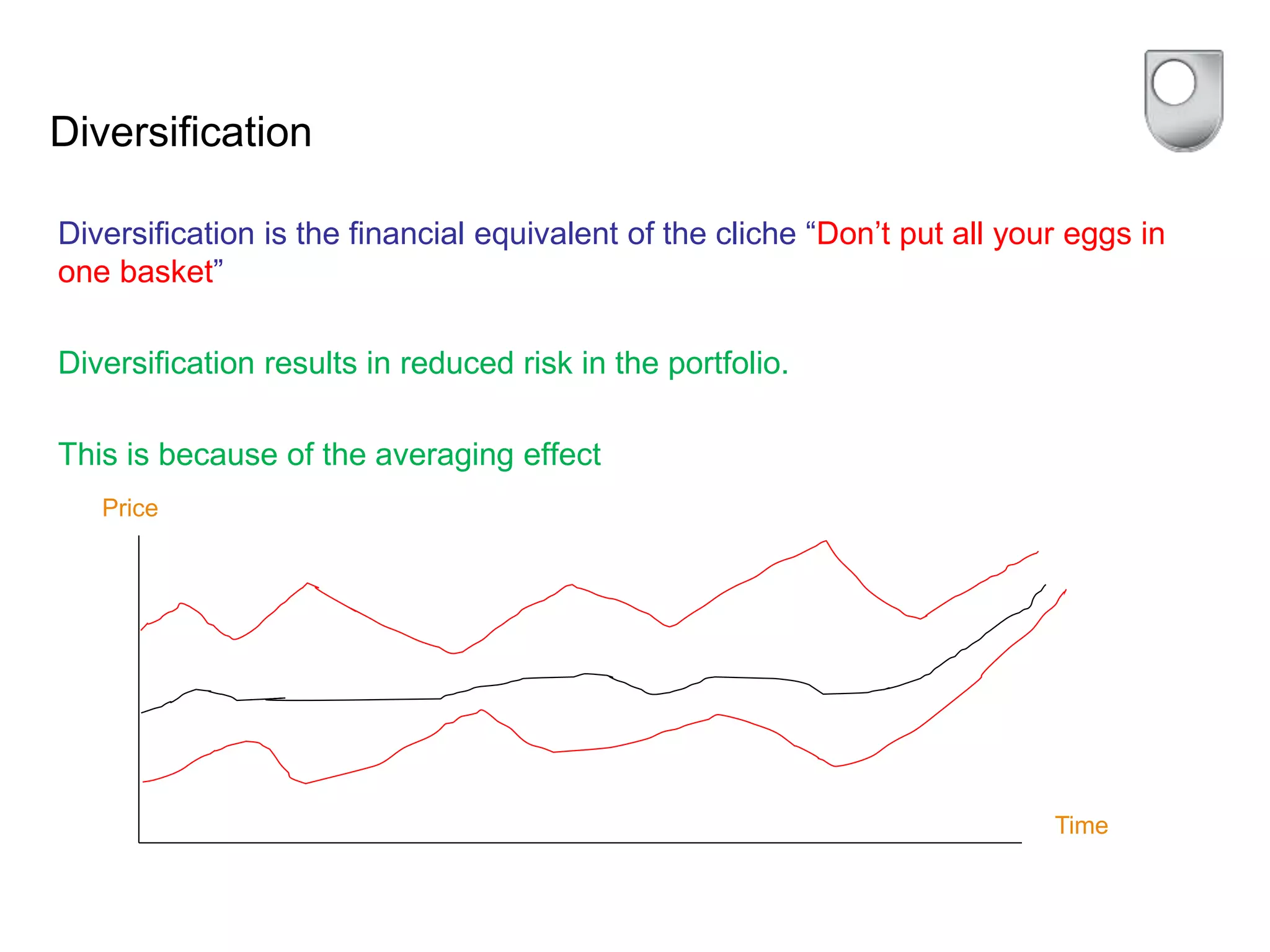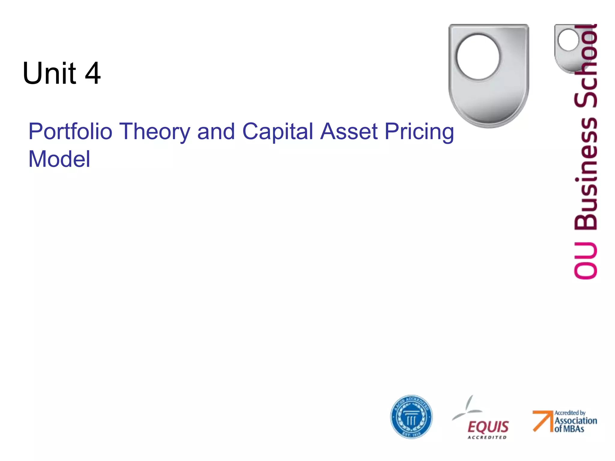 This document discusses portfolio theory and the Capital Asset Pricing Model (CAPM). It explains that diversification reduces risk through averaging effects. While specific risk can be diversified away, market risk cannot. Portfolio theory assumes investors are risk averse and seek the highest returns for a given level of risk. The CAPM uses beta to measure a stock's risk relative to the market and defines the security market line, where expected return is equal to the risk-free rate plus a risk premium based on beta. Stocks with beta greater than one are more volatile than the market.