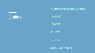 The document outlines various special semiconductor devices including zener diodes, schottky diodes, varactor diodes, laser diodes, and more, detailing their structures, principles, and applications. It emphasizes the functionality of these devices in electronic circuits, highlighting unique properties such as the zener effect in zener diodes and the low voltage drop in schottky diodes. Additionally, it introduces advanced devices like finfet and cntfet, noting their superior performance in specific applications like telecommunications and logic circuits.