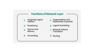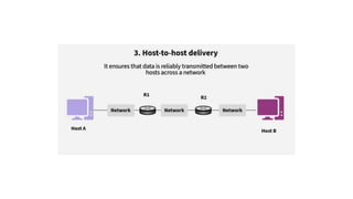 The Network Layer (Layer 3) is responsible for transferring data from one device to another across multiple networks. It uses IP addresses to identify devices and relies on routing to choose the best path for data packets to travel. The Transport Layer (Layer 4), on the other hand, ensures reliable end-to-end communication between applications running on different devices. It breaks data into segments, controls data flow, checks for errors, and uses TCP for reliable communication and UDP for faster, connectionless communication.