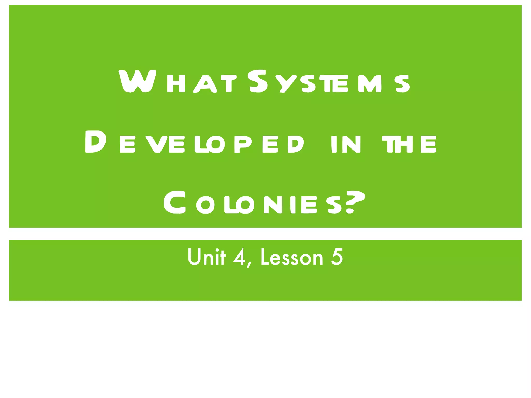 The document summarizes the economic systems that developed in the colonies. A free-market economy existed where prices were not controlled by the king and each colony had its own government. Children would become apprentices at age 9-10, learning a trade and working for room and board until age 21 when they could work as a journeyman or start their own business. Indentured servants were people who could not pay for their voyage and worked for families for several years to pay off their debt. Slavery began as the tobacco industry grew and plantations required cheap labor for crops like rice, indigo, and cotton. The slave population in Virginia increased from less than 200 in 1640 to over 28,000 by 1700.