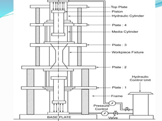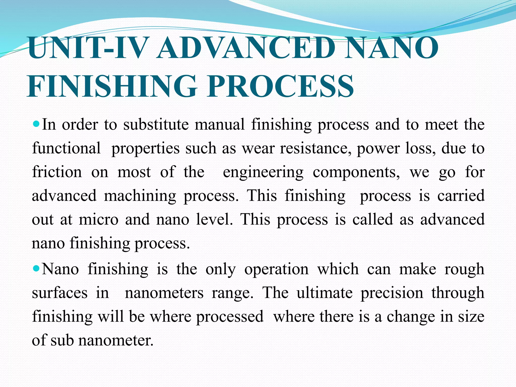 This document discusses abrasive flow machining (AFM), a type of nano finishing process. AFM uses a semisolid abrasive media to remove small amounts of material from surfaces at the micro and nano scale, allowing it to finish surfaces with roughness in the nanometer range. The document describes the working principle of AFM, including how the abrasive media is extruded through the workpiece under pressure to cut micro/nano chips. It also discusses types of AFM like one-way, two-way, and orbital, as well as parameters that affect the process like added plasticizers, extrusion pressure, and number of cycles.