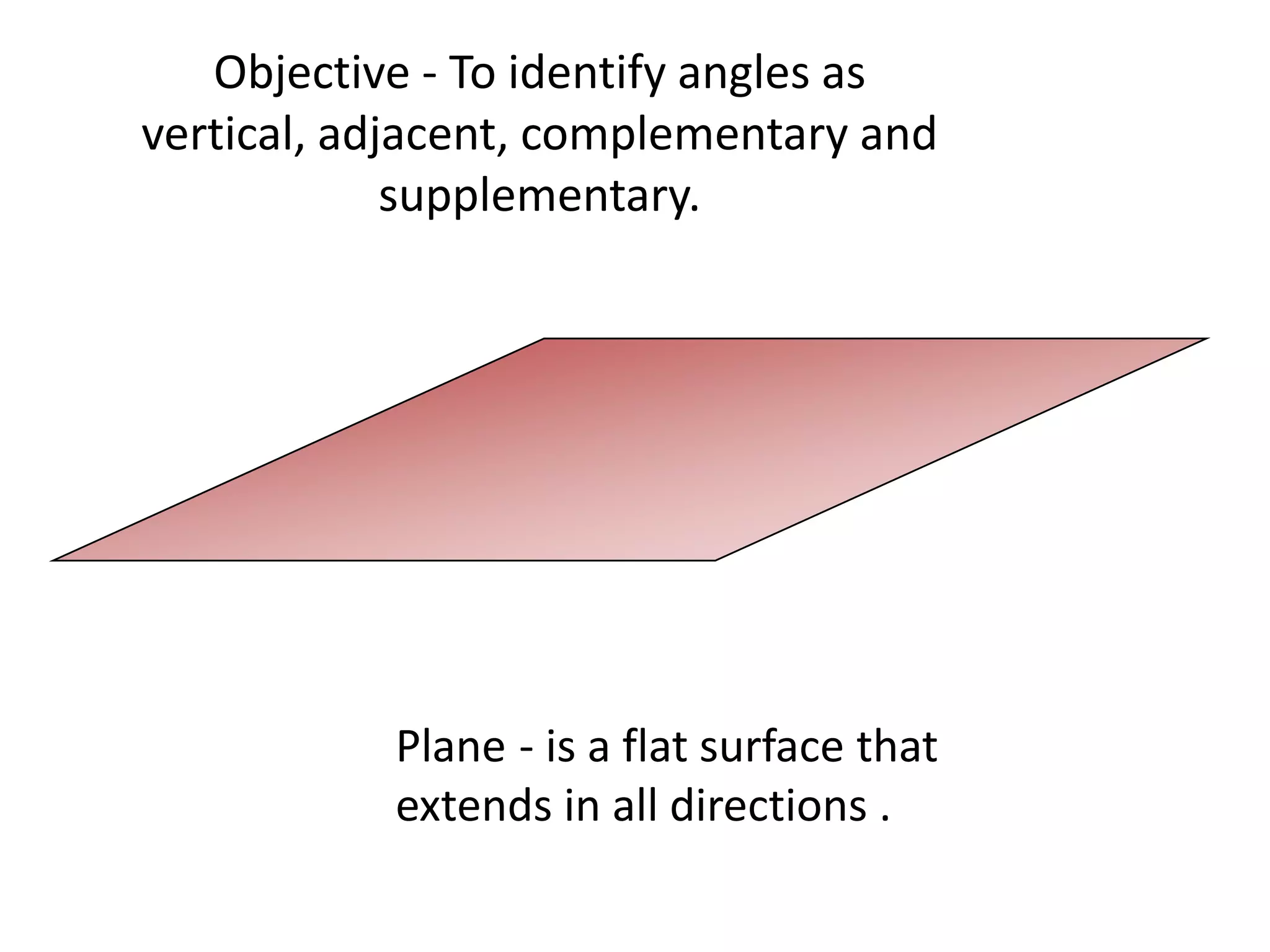 This document provides information about different types of angles and triangles. It defines vertical angles, adjacent angles, complementary angles, supplementary angles, acute triangles, right triangles, obtuse triangles, isosceles triangles, equilateral triangles, and scalene triangles. It also discusses properties of parallelograms, rectangles, and squares. Examples are provided to classify different angles and triangle types.