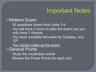The midterm exam will cover Units 1-4 and include 50 multiple choice questions. Students must complete the exam by July 12th in a single 3-hour sitting, with no make-ups allowed. To prepare, students should study vocabulary words, review unit PowerPoints, and ensure they understand key concepts from each unit, including political theories, types of governments and electoral systems, and differences between parliamentary and presidential systems.