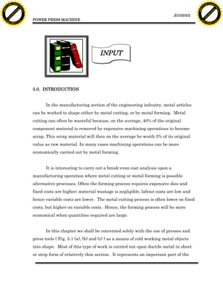 This document discusses power press machines and their use in cold metal working. It introduces the objectives of understanding the types and functions of presses and press tools, being able to sketch their parts, and elaborating on methods of cold working sheet metal through shearing, bending, and drawing. It then provides background on how metal forming can be more economical than metal cutting for large production quantities due to lower variable costs, despite higher fixed costs for dies. The document focuses on using presses and press tools for cold working metal objects into shape, especially ductile sheet or strip metals.