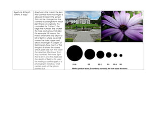 - Shutter speed, aperture, ISO, and depth of field which affect light and focus in photos.