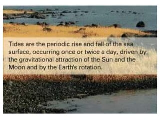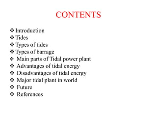 This document discusses tidal power as a renewable energy source. Tidal power harnesses the energy from ocean tides and converts it into electricity. Tidal power plants typically use a tidal barrage to capture water on high tides, which is then released through turbines to generate electricity on the outgoing tides. The document outlines the key components of tidal power plants including barrages, sluice gates, and tidal stream generators. It also discusses advantages like predictability and lack of emissions, and disadvantages such as high costs and potential environmental impacts. Major existing tidal power plants are mentioned as well as the future potential of tidal energy.