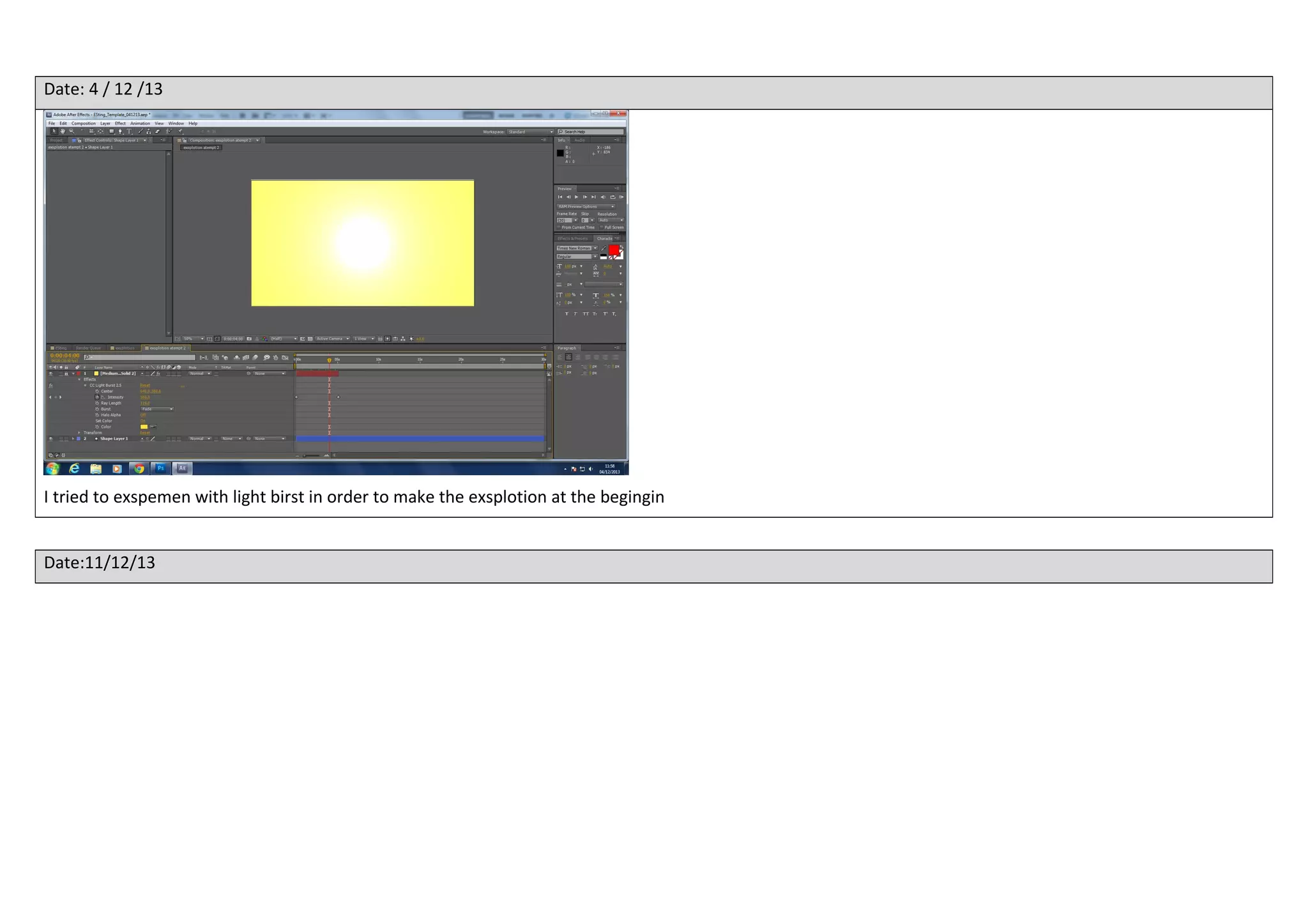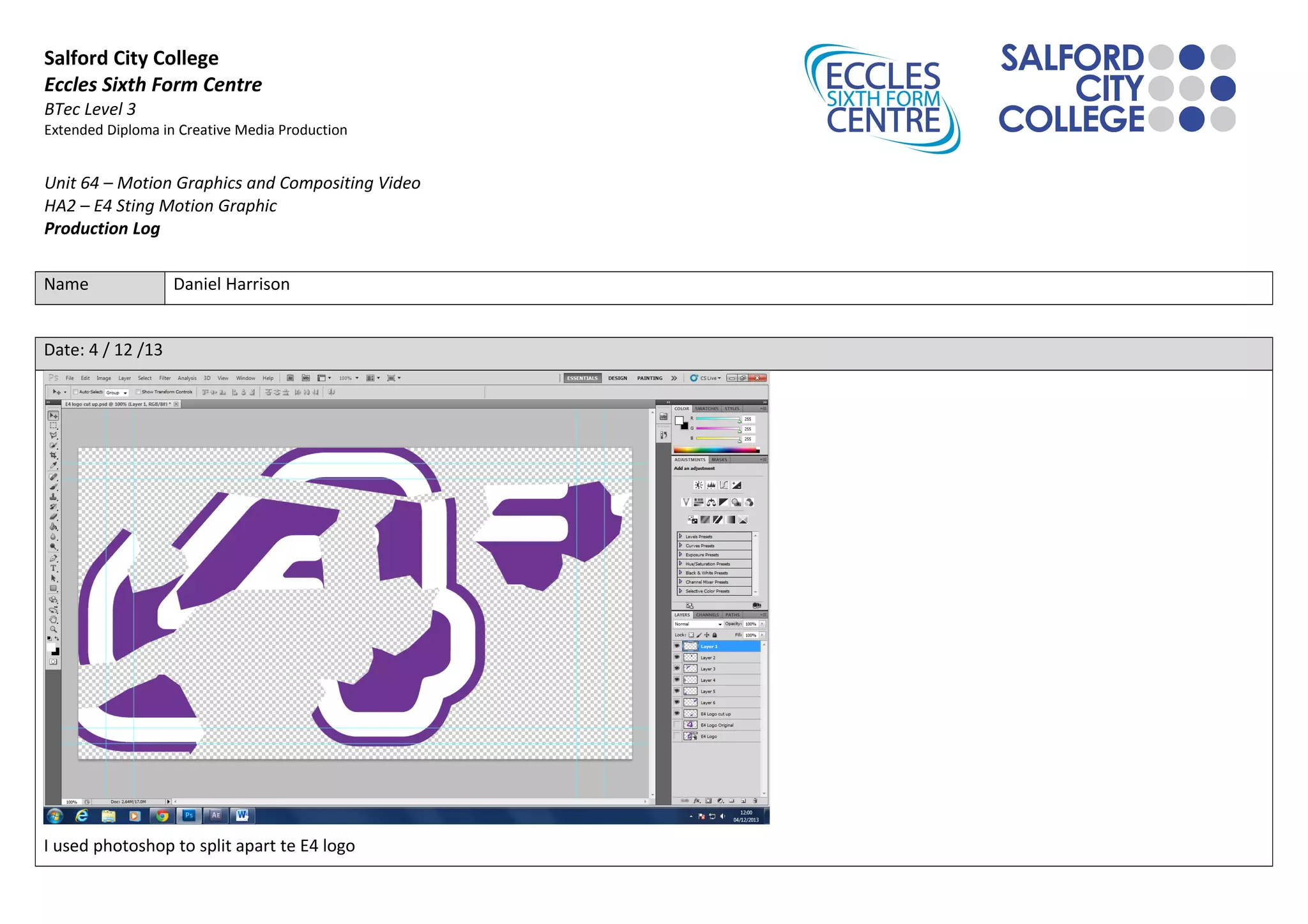 The document is a production log from Daniel Harrison, a student at Salford City College Eccles Sixth Form Centre, for his BTec Level 3 Extended Diploma in Creative Media Production unit on motion graphics and compositing video. Over several dates in December 2013, Daniel experimented with different effects in Photoshop and After Effects to create an exploding E4 logo sting graphic, trying light burst, particle world, and position commands to get the desired visual effects.