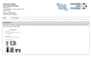 This document contains production notes from a student named Ross Loynd detailing the process of modeling a sidekick character for a games design project between March 10th and April 14th. Over the course of several weeks, Ross worked on designing the character, modeling the body, adding details like a head and wings, and focusing on materials and lighting to showcase the character within a virtual environment.