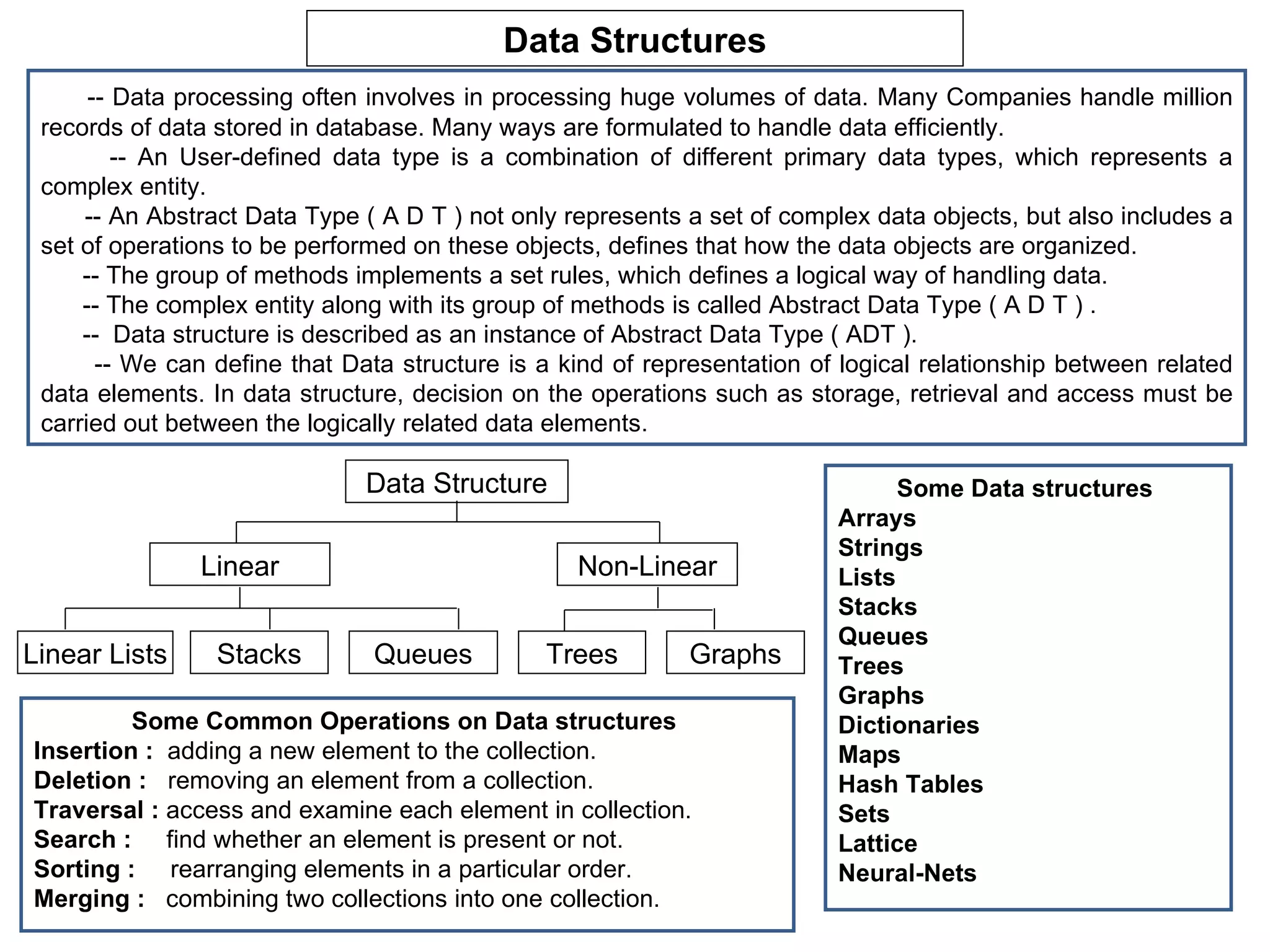 - Data structures allow for efficient handling of large volumes of data through logical organization and relationships between data elements. Common linear data structures include arrays, lists, stacks, and queues, while trees and graphs are examples of non-linear data structures.