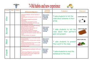 This document outlines a lesson plan containing 4 classes. The first class focuses on expressing obligation and necessity using have to and must. Students will role play and discuss describing people in their group. The second class contrasts habits in the past with present using used to. Students will role play and discuss partners' past and present habits. The third class describes experiences using the present perfect and past simple tenses. Students will present an event to the class. The fourth class compares present and past using used to and expresses obligation reviewing verb tenses through role plays and readings.
