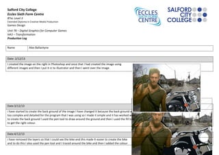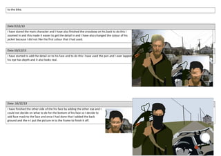 This production log documents a student's progress in creating a digital graphic for a computer games design course. Over several dates, the student created the background using simple shapes, added a bike by tracing its outline and filling color, and then worked on the main character - giving him a crossbow, changing his jacket color, adding detail to his face including depth to his eye using overlapping layers, and finally adding a face mask and putting the completed graphic into a frame.
