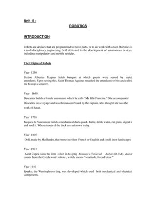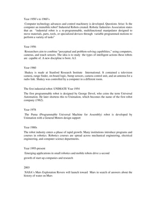 2. The origins of robots date back to the 13th century, with developments like mechanical attendants and automations throughout history. Modern robotics emerged in the 1950s-60s with advances in computer technology and control systems.