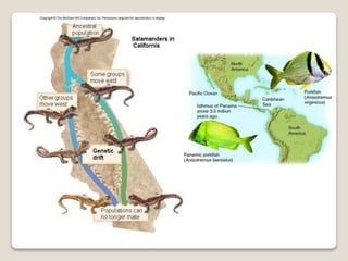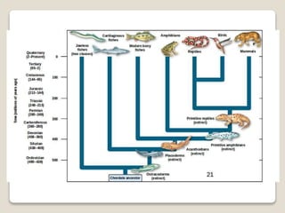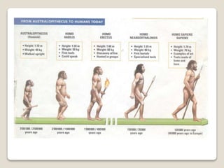 The document summarizes key concepts in the evolution of life. It discusses early theories of spontaneous generation and the Miller-Urey experiment demonstrating organic molecules can form from inorganic precursors. Modern evolutionary theory developed from Darwin's principles of variation within populations, a struggle for existence, and survival of the fittest. Evidence for evolution includes homologous and vestigial structures, transitional fossils, embryological similarities, and molecular comparisons. Present-day evolution theories have expanded on Darwin's work through ideas like punctuated equilibrium, selfish genes, and the endosymbiotic origin of eukaryotic cells. New species arise through genetic isolation of populations and their gradual differentiation over time. The appearance of human beings is traced from early homin