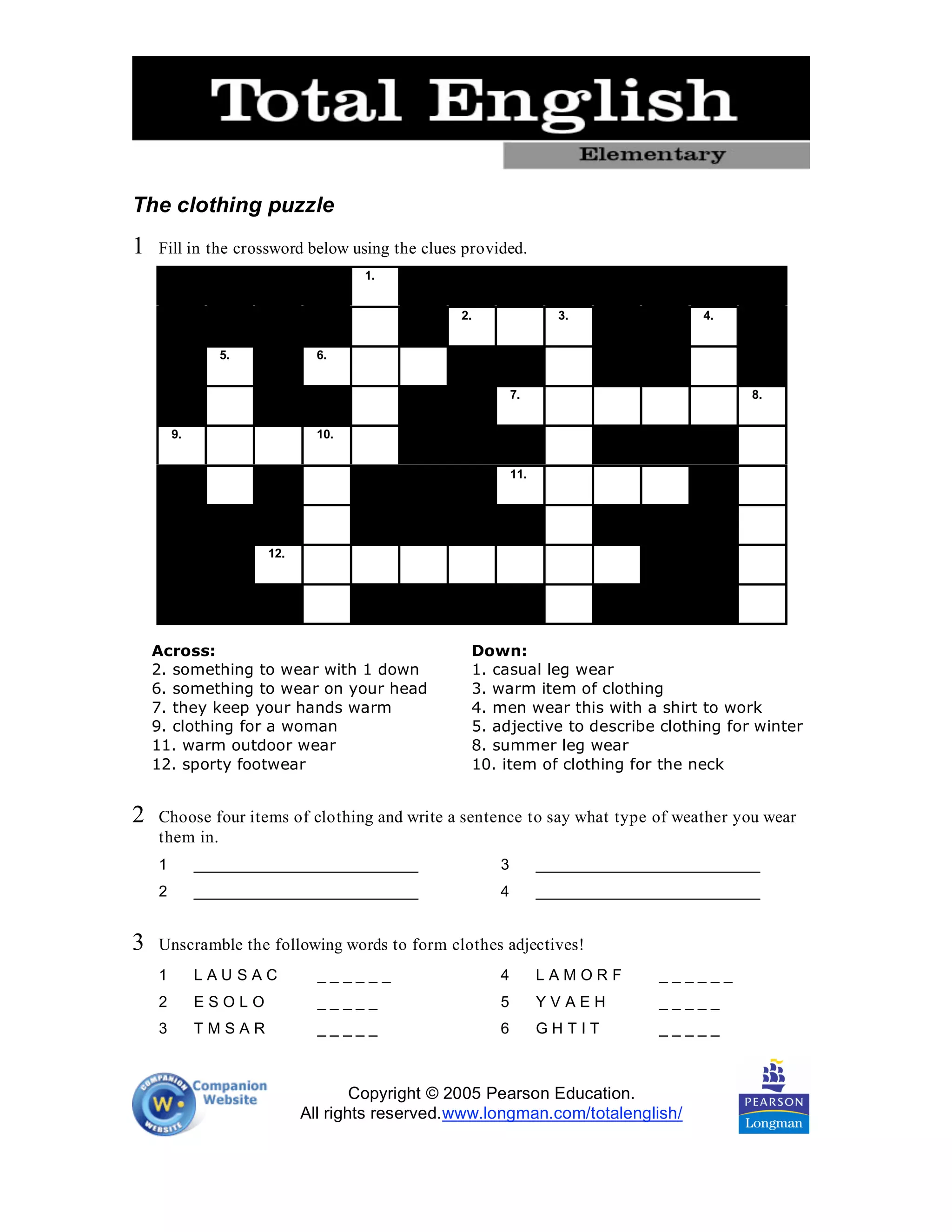 The document provides a clothing-themed crossword puzzle and vocabulary exercise. It contains a 12-item crossword with clothing-related clues to fill in. It then asks students to write sentences matching four items of clothing to different weather types. Finally, it has students unscramble six clothing adjective anagrams. The goal is to consolidate vocabulary from a lesson about clothing descriptions.