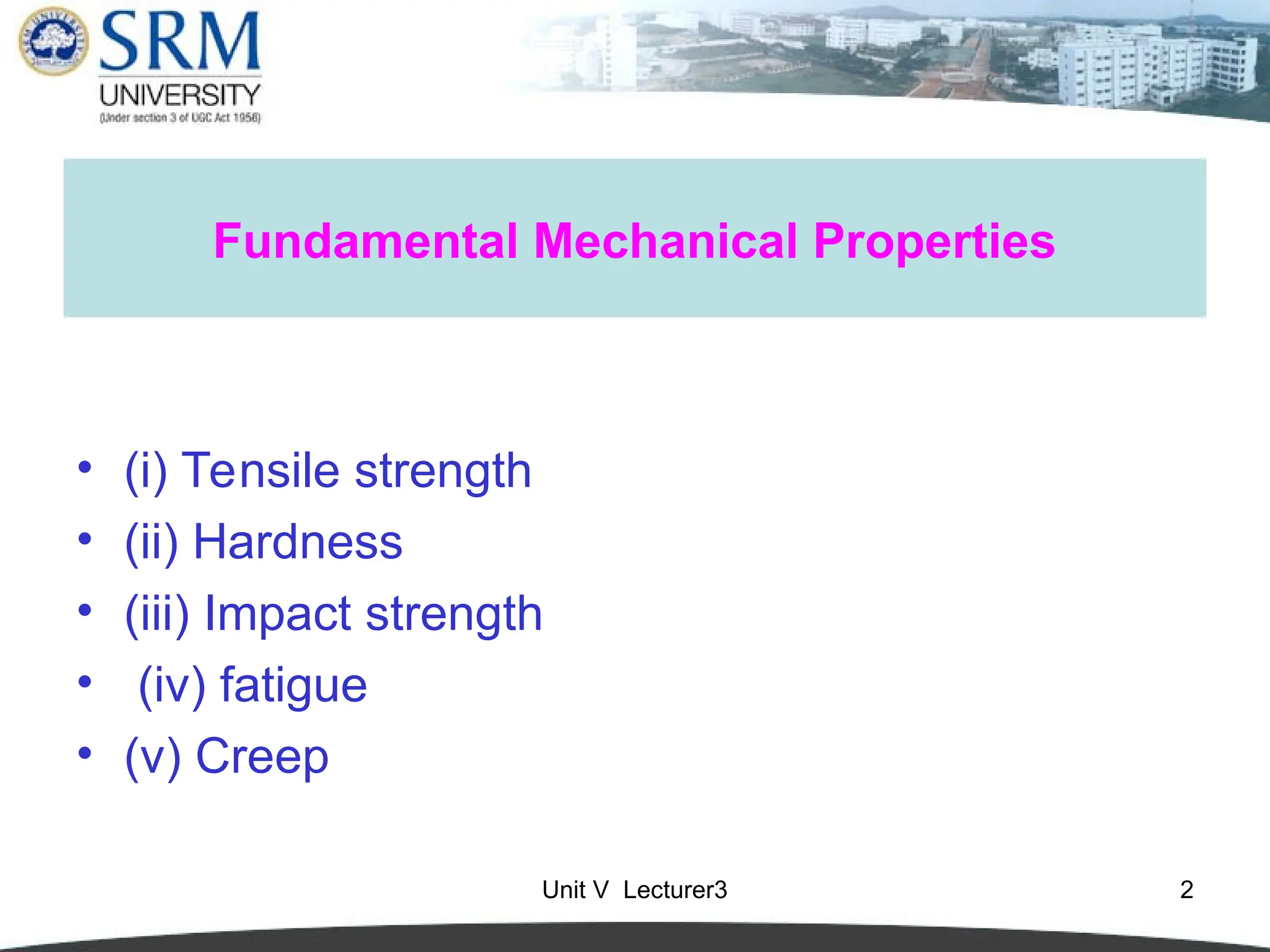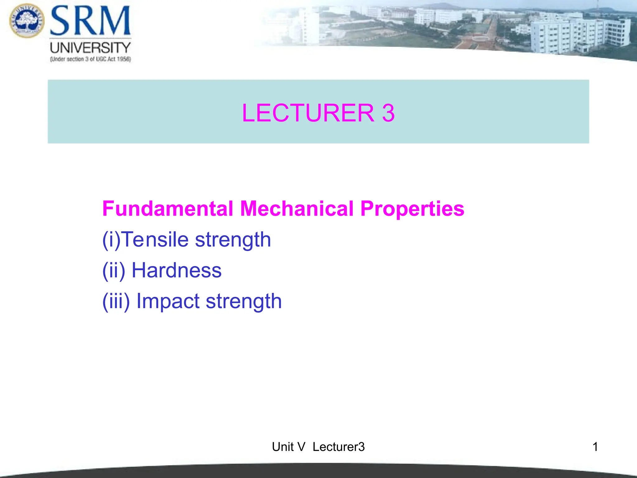 The document discusses fundamental mechanical properties of materials, focusing on tensile strength, hardness, and impact strength. It explains definitions and measurement methods for each property, detailing how they relate to material performance and failure. Additionally, it explores factors affecting impact strength, including specimen dimensions, notch sharpness, temperature, and loading conditions.