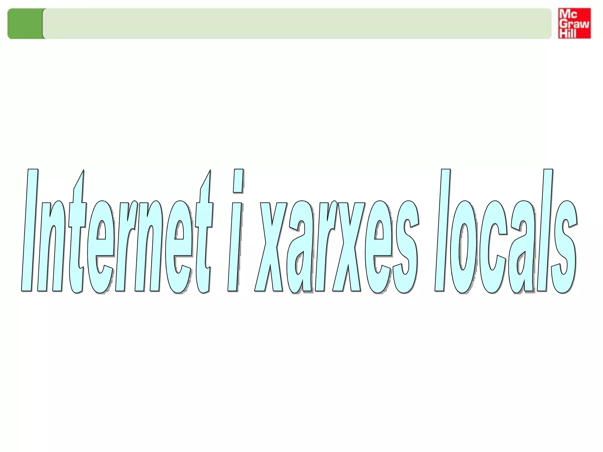 Internet i xarxeslocals Xarxes: els ordinadors es comuniquen L’ordinador disposa d’una placa electrònica, anomenada placa de xarxa , que és la que pot establir comunicació amb altres ordinadors La placa de xarxa que s’empra habitualment en les xarxes domèstiques i en els centres docents són del tipus Ethernet . Per connectar diversos ordinadors a una xarxa cal un dispositiu anomenat switch , hub o concentrador . Rep aquest nom pel fet que actua com si fos el centre de connexió d’un cablat en forma radial. El cable de connexió és especial, i en els seus extrems porta un connector mascle anomenat RJ45 que es pot endollar indistintament a l‘ordinador o al concentrador. La connexió sense fils o WiFi (de l’anglès Wireless Fidelity ) fa la mateixa funció, però amb ones de ràdio en comptes de cable. La flexibilitat i comoditat d’aquest tipus de connexió fa que estigui cada vegada més estesa. Aquests tipus de xarxes petites reben el nom de xarxes d’àrea local o LAN (de l’anglès Local Area Network ).