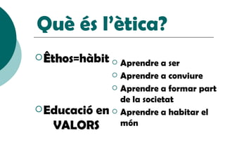Què és l’ètica?Êthos =hàbit Educació en VALORS Aprendre a ser Aprendre a conviure Aprendre a formar part de la societat Aprendre a habitar el món