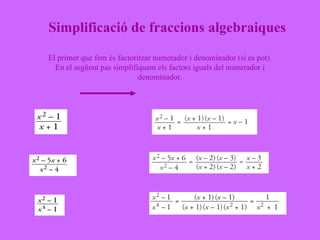 Simplificació de fraccionsalgebraiques El primer que fem és factoritzar numerador i denominador (si es pot). En el següent pas simplifiquem els factors iguals del numerador i denominador.