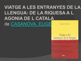 L’estructura del llibreés temporal, lineal: des del primer dia de classe en un institut –un nou destí laboral, a comarques, en una localitat turística, cosmopolita i plena de contrastos (Pineda de Mar), fins al darrer dia del curs escolar. Passa pels diferents nivells d’ESO i batxillerat, i en cada un en fa pinzellades que són de universal. La prosa de Sala és àgil, amena, planera. És impossible no entrar-hi. No solidaritzar-se amb aquesta cosmogonia educativa. VIATGE A LES ENTRANYES DE LA LLENGUA: DE LA RIQUESA A L AGONIA DE L CATALAde CASANOVA, EUGENI