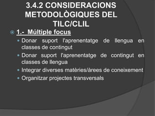 d) (Sobre l’organitzacióglobal). Si reconeixem que: “alguns continguts lingüístics es poden aprendre en una llengua i una vegada apresos poden fer-se servir en una altra” podem millorar l’eficàcia d’un ensenyament que exigeix tres llengües. Com?L’enfocament integrat de les llengües és un enfocament complexi per tant ha de ser el resultat de la confluència de tres processos en els quals van prenent-se decisions, basades en principis didàctics rigorosos i adequades al context en què s’han d’aplicar.