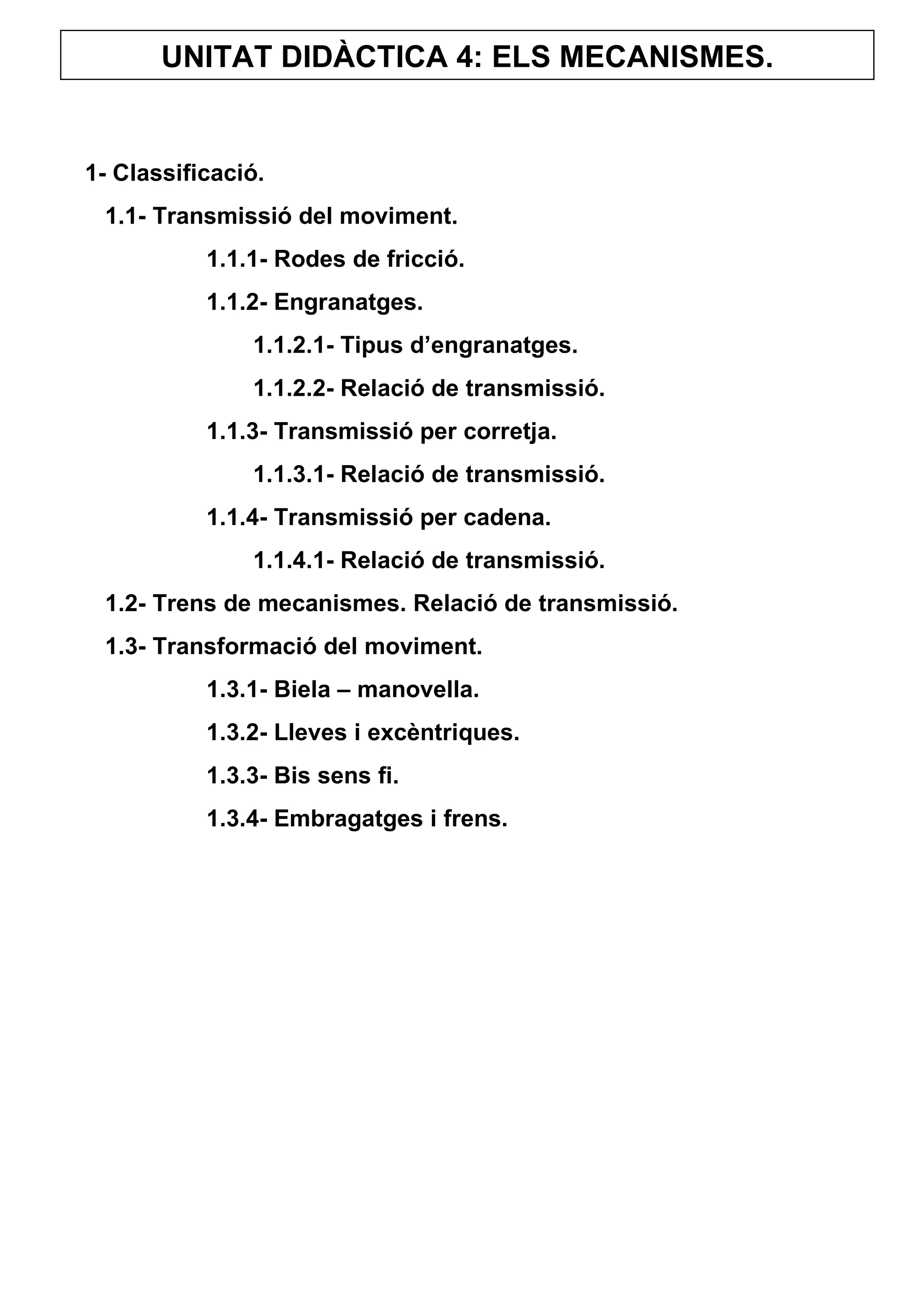 UNITAT DIDÀCTICA 4:ELS MECANISMES. 1- Classificació. 1.1- Transmissió del moviment. 1.1.1- Rodes de fricció. 1.1.2- Engranatges. 1.1.2.1- Tipus d’engranatges. 1.1.2.2- Relació de transmissió. 1.1.3- Transmissió per corretja. 1.1.3.1- Relació de transmissió. 1.1.4- Transmissió per cadena. 1.1.4.1- Relació de transmissió. 1.2- Trens de mecanismes. Relació de transmissió. 1.3- Transformació del moviment. 1.3.1- Biela – manovella. 1.3.2- Lleves i excèntriques. 1.3.3- Bis sens fi. 1.3.4- Embragatges i frens.