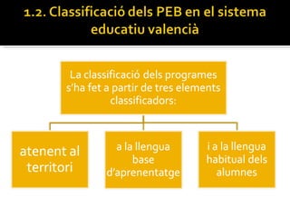 En les poblacions de predomini lingüístic valencià , els centres amb un nombre d'alumnes majoritàriament valencianoparlants podran adoptar, quan les condicions sociolingüístiques del context ho permeten, El Programa d'Ensenyament en Valencià , que comportarà l'ús del valencià com a llengua base d'aprenentatge en tot el tram de l’Educació Infantil i Primària. El Programa d’Ensenyament en Valencià continua , de forma coherent, en ESO . En aquest programa la major part de les àrees no lingüístiques tenen el valencià com a llengua vehicular d’aprenentatge.