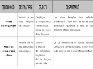 D’acord amb elque exposen Pascual, V. i Sala, V. (1992), “la peculiar distribució territorial del valencià i el castellà i el marc legal autonòmic impliquen, per al sistema escolar de la Comunitat Valenciana, l’adopció d’un tipus d’educació monolingüe, amb el castellà com a llengua d’instrucció i el valencià com a simple matèria d’estudi, per al territori de predomini lingüístic castellà; per al territori de predomini lingüístic valencià, En canvi, comporta un tipus d’educació bilingüe, amb el valencià i el castellà com a llengües d’instrucció, concretament anomenat model d’enriquiment. La característica fonamental d’aquest model consisteix en el fet d’estar dissenyat per a tota la comunitat i no solament per als parlants de la llengua minoritzada . El seu objectiu primordial és que tots els membres, qualsevol que siga la llengua materna, assolisquen un domini efectiu de totes dos llengües, sense perjudici de l’aprenentatge d’una llengua estrangera en edats ben primerenques, o d’una altra més tard, si s’escau, mal que siga a nivells merament funcionals.