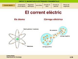 1. Magnituds elèctriquesfonamentals Entenem per magnitud tot el que es pot mesurar (ex. en els cotxes es mesura la seva velocitat ). Les magnituds fonamentals que caracteritzen el corrent elèctric són: Tensió Intensitat Elèctrica Resistència Magnituds elèctriques