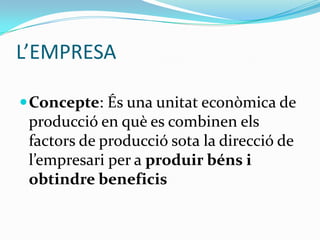 L’EMPRESAConcepte: És unaunitat econòmica de producció en què es combinen els factors de producció sota la direcció de l’empresari per a produir béns i obtindre beneficis