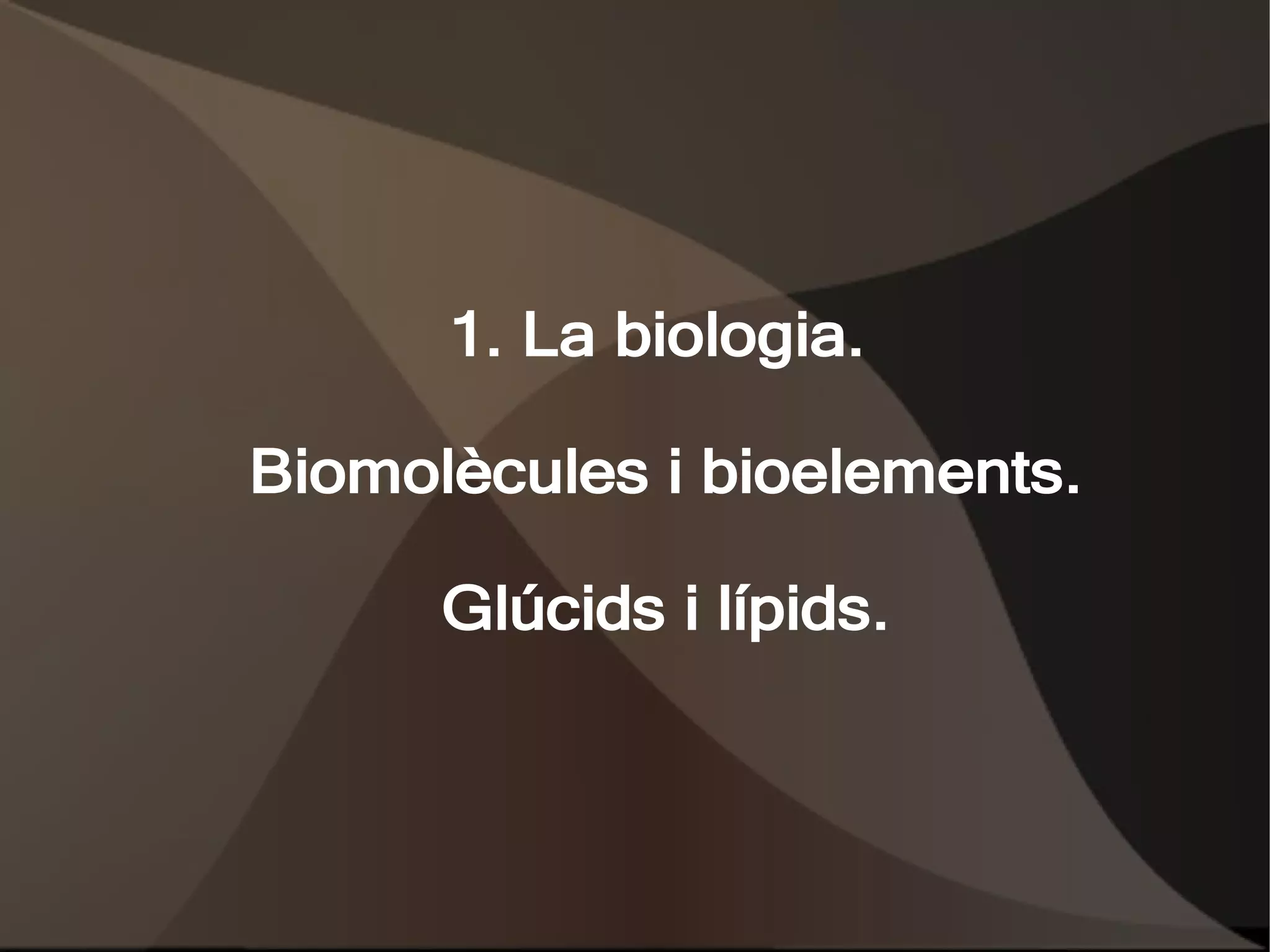 LA BIOLOGIA 1.Què és la biologia 2. Evolució de la biologia 3. Teoria i models en la investigació ELS BIOELEMENTS Índex LES BIOMOLÈCULES 1. Biomolècules inorgàniques: 1.1. AIGUA 1.2. SALS MINERALS 2. Biomolècules orgàniques 2.1. GLÚCIDS 2.2. LÍPIDS