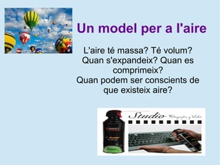 #7 L'aire té massa i ocupa un volum. Ho podem comprovar si pesem una pilota abans i desprès d'inflar-la, ja ha augmentat el pes, per tant, ha estat cosa de que l'aire pesa.