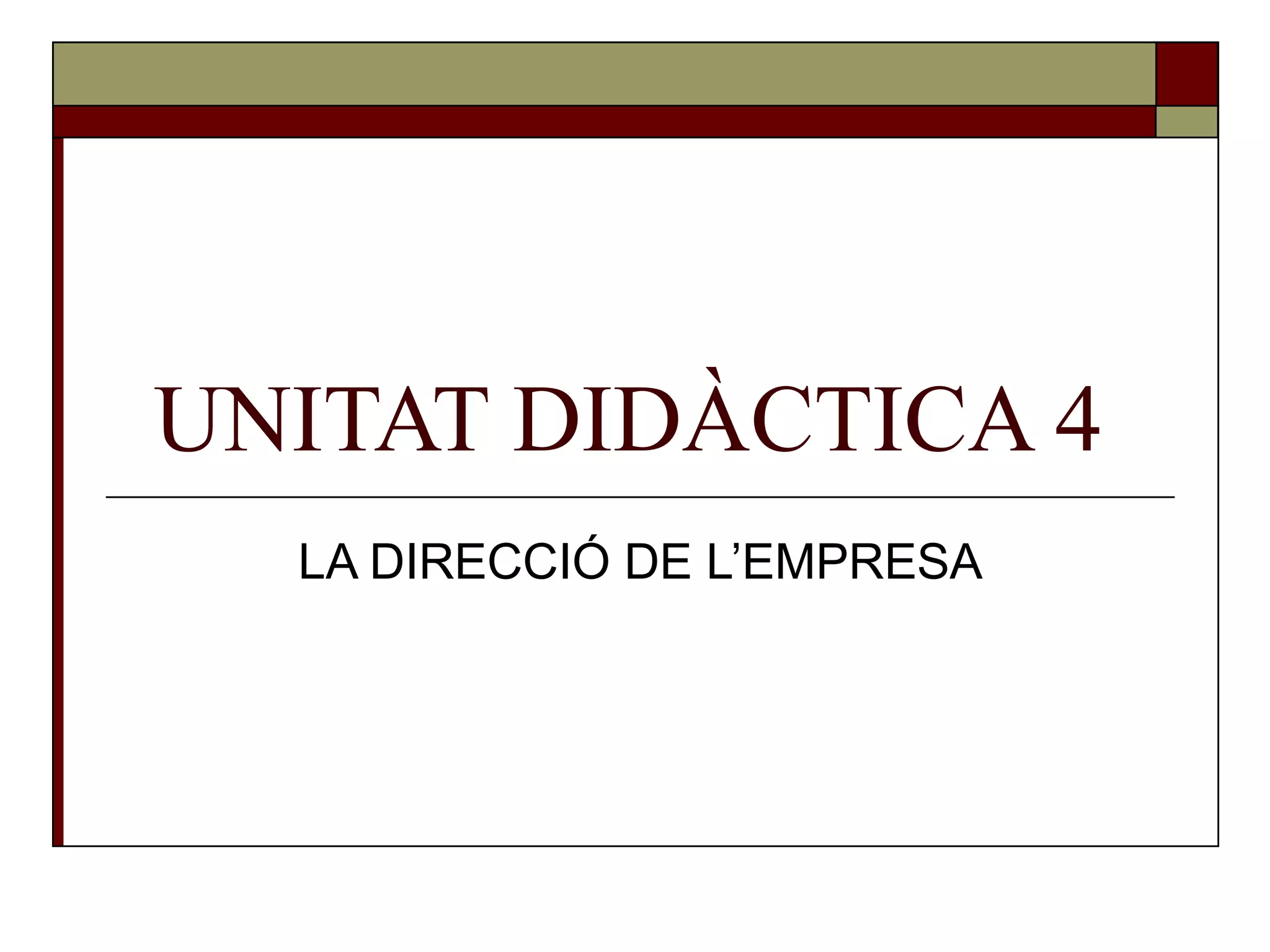 OBJECTIUS Valorar lanecessitat d’una direcció eficaç de l’empresa i la seva responsabilitat per a obtenir els objectius proposats, i identificar-ne les funcions: planificació, organització, gestió i control. Conèixer quins són els diferents estils de direcció i relacionar-los amb el comportament i la motivació dels treballadors.