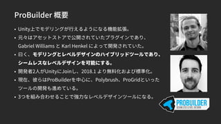 Unite Tokyo 2018 Training Day「ProBuilderで学ぶレベルデザイン ProBuilderをマスターしよう!」の資料です。