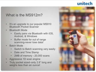 The MS912M is a compact, Bluetooth pocket scanner that features easy pairing with various devices and has a memory capacity of 2MB for up to 20,000 scans. It offers multiple scanning modes, including batch mode, and is designed for use in markets like retail, asset tracking, and field service. Weighing less than an ounce and measuring just 2.8 inches, it is portable and durable with a drop spec of 5 feet.
