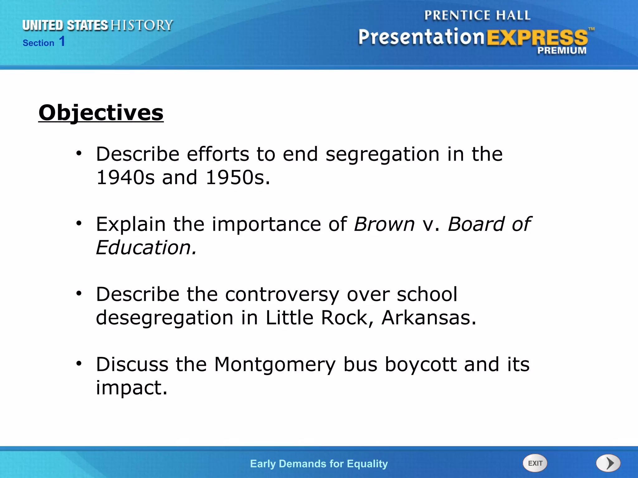 The document summarizes early efforts for equality in the 1940s-1950s. It discusses how African Americans challenged segregation through legal and protest efforts such as the Montgomery bus boycott. The Brown v. Board of Education Supreme Court decision declared segregation in public schools unconstitutional, though it faced resistance from Southern states. The Montgomery bus boycott launched Martin Luther King Jr. and the civil rights movement by proving that nonviolent protests could successfully demand change. However, segregation and discrimination remained widespread even after these early victories.