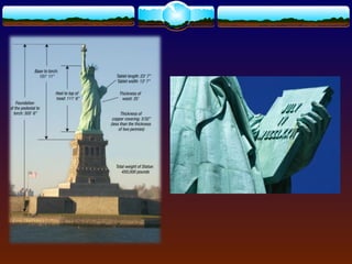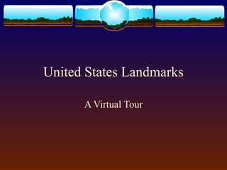 The document provides descriptions of famous United States landmarks, including the Statue of Liberty, Mount Rushmore, Golden Gate Bridge, Empire State Building, Washington Monument, Alamo, Death Valley, Old Faithful, Crater Lake, Four Corners, Niagara Falls, Hoover Dam, Cape Hatteras, Arches National Park, Redwood National Forest, Crater of Diamonds, and Grand Canyon. Each landmark is briefly described in one or two sentences with key details about its location, history, and features.