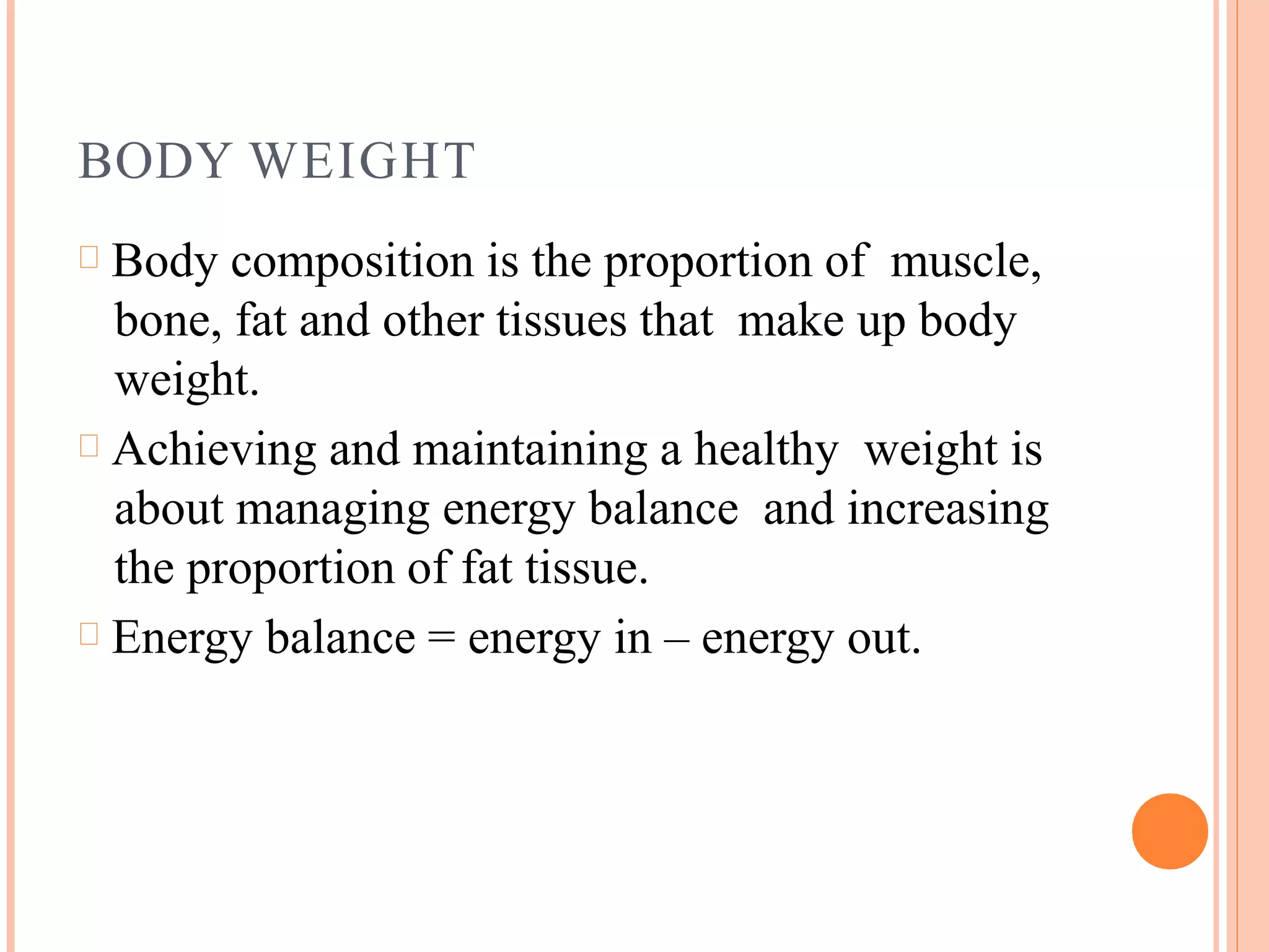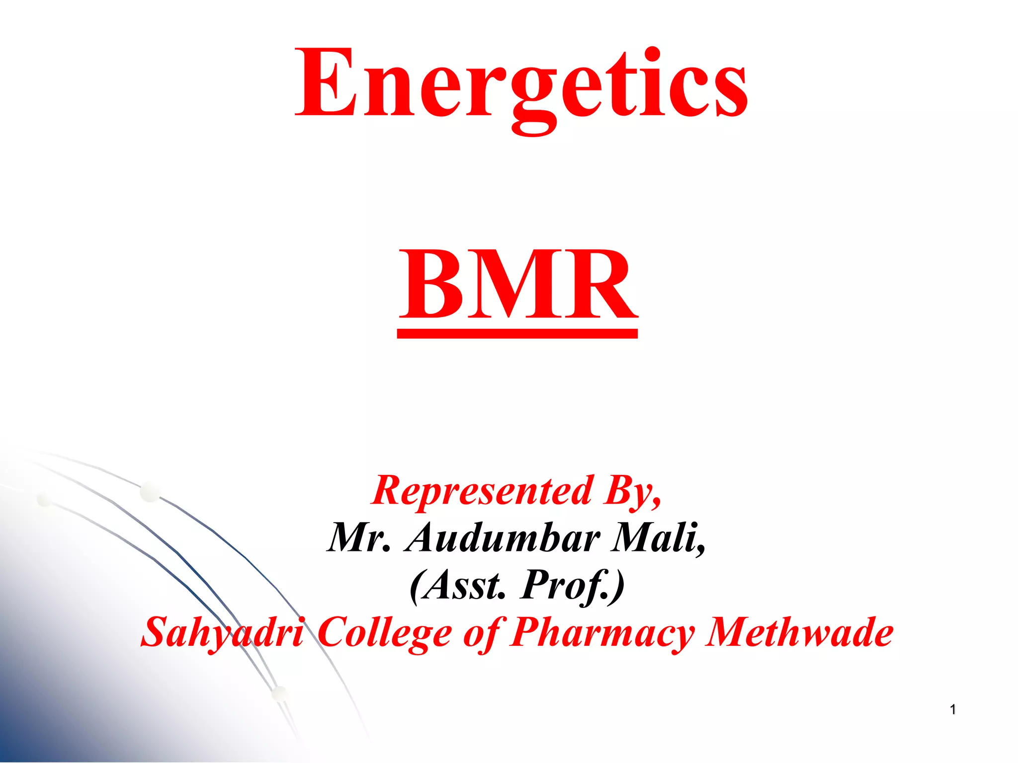 The document discusses the basal metabolic rate (BMR), which is the minimum amount of energy required to sustain vital functions at rest. It explains that BMR can be affected by factors like age, height, body composition, fever, stress, and thyroid function. Normal BMR values are provided as 34-37 kcal/square meter/hour for adult men and 30-35 kcal/Sq.m./hour for adult women.