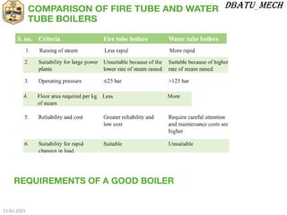 The document discusses factors affecting boiler selection and types of boilers. It describes key factors like steam output required, working pressure, fuel availability, and cost. Fire tube boilers discussed include Lancashire, Cornish, locomotive, and Cochran. Water tube boilers mentioned are suitable for pressures above 10 bar and output over 7000 kg/hr, such as Babcock & Wilcox and Stirling. Details are provided on Lancashire, locomotive, B&W, and Stirling boiler designs. Mountings, accessories, circulation methods, and high pressure boilers are also covered.