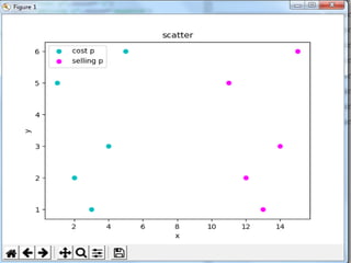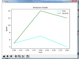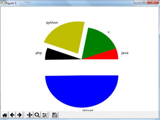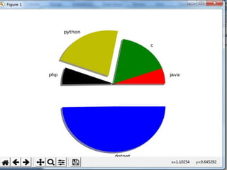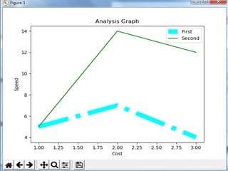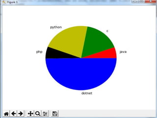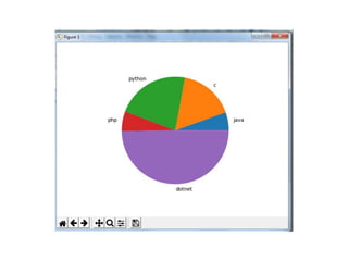 This document discusses how to create line charts, bar charts, pie charts, histograms, and scatter plots using Matplotlib in Python. It covers how to import Matplotlib, customize line styles, colors, markers, legends, titles and labels. It provides code examples for plotting single and multiple lines, formatting plots, saving figures, and using different chart types like pie charts, bar charts and histograms.