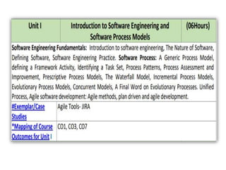This document provides an overview of software engineering concepts including: