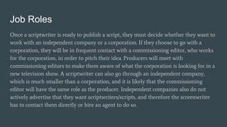 1) Commissioning editors at corporations and independent companies select ideas for new television shows and work with producers and scriptwriters.