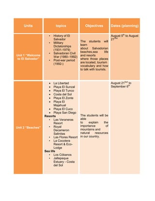 This document outlines a 6-unit curriculum plan for teaching students about El Salvador. Unit topics include the history and geography of El Salvador, its beaches, mountains, archaeological sites, rivers and lakes, and its food. Each unit provides objectives and planned dates. The objectives focus on teaching students about Salvadorian culture, geography, and natural resources to promote tourism and cultural understanding.