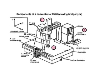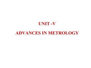 The document discusses advances in metrology, including laser interferometry and coordinate measuring machines (CMMs). It describes the principles and components of laser interferometry, including laser sources, optical elements, and measurement receivers. Coordinate measuring machines are discussed, including their construction, types of probes, accuracy considerations, and applications for precision inspection. Computer-aided inspection using machine vision systems is also summarized, outlining the key stages of image generation, processing, and analysis.